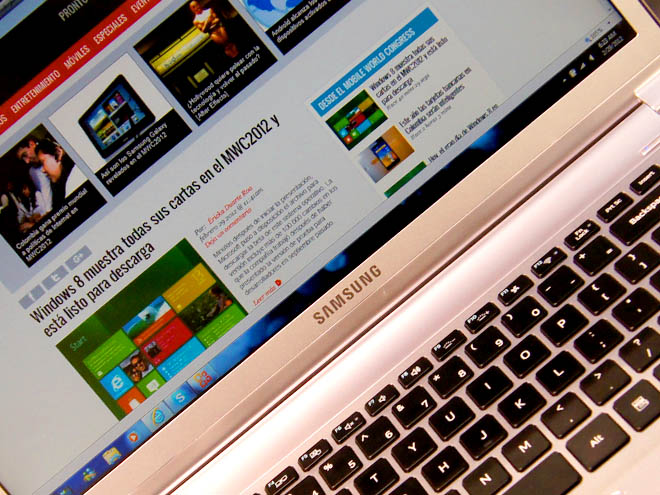 Sin embargo, quizás lo que más nos sorprendió fue su nuevo diseño, que además se separa de la manada de ultrabooks que se limitan a imitar al MacBook Air. Viene en un aluminio más oscuro que el producto de Apple y, en lugar de adelgazar de forma uniforme de atrás hacia adelante, como el Air, el Samsung Serie 9 tiene solo una pequeña parte más gruesa que el resto del cuerpo del aparato, que es delgado de manera uniforme. Sin embargo, parece que no llega a ser tan delgado como el Air en su punto más mínimo.